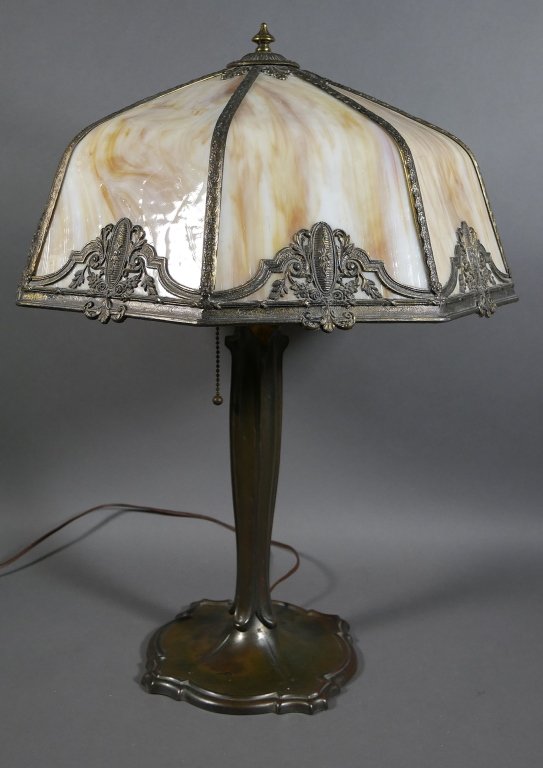 ANTIQUE SLAG GLASS TABLE LAMP W/ METAL OVERLAY