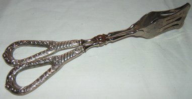 SoldLarge Sterling Silver Tongs Medallion PatternMeasure 10 1/2" long, marked sterling. Total weight 142.3 grams.See Sold Price