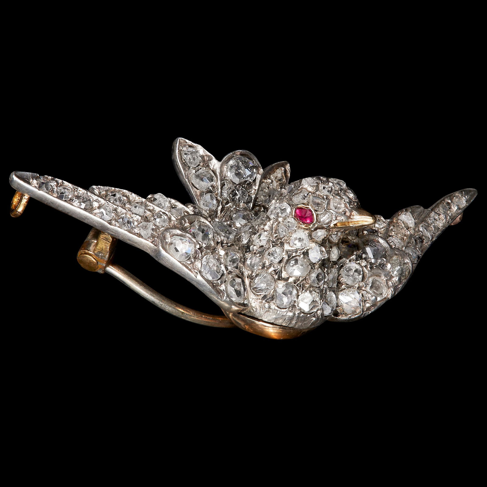 SoldANTIQUE VICTORIAN DIAMOND AND RUBY SWALLOW BROOCHANTIQUE VICTORIAN DIAMOND AND RUBY SWALLOW BROOCH,in high carat gold.Fine 3-D design. Diamonds approx. 1.80 ct., bright and livelyW. 4.4 cm. 7.5 grams.Fine workmanship, lovely conditionSee Sold Price