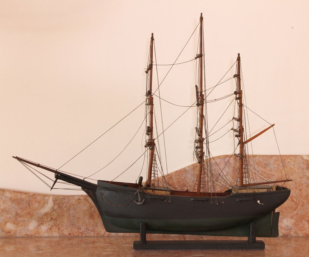 SoldAntique French Model Sailing ShipAntique French Wooden Model Sailing Ship on Presentation Stand. Well done and extremely detailed having with three masts, very intricate rigging, cannons, life boat, and cloth sails. Unsigned. MeasureSee Sold Price