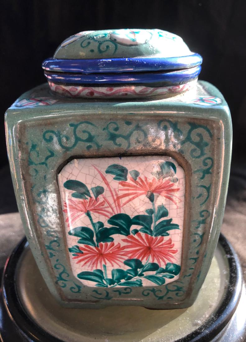 SoldEnameled Yixing Tea Caddy, Republic PeriodEnameled Yixing Tea Caddy Republic Period {Height: 7 inches (17.8 cm) approximately} [Overall wear, small chips]See Sold Price