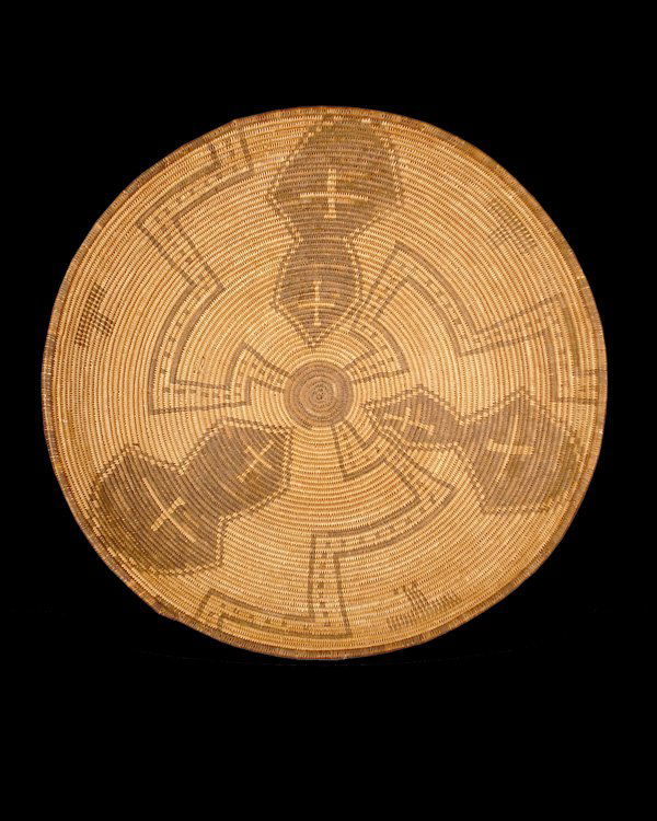 Sold1900s Pima / Papago Basket Tray Stylized ThunderbirdNative American, Southwestern United States, Akimel O'odham (Pima) or Tohono O'odham (Papago), ca. late 19th to early 20th century CE. A beautiful and tightly woven basketry tray made from natural vegSee Sold Price