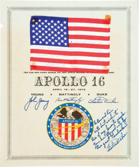 APOLLO 11 - SIGNED FIRST DAY COVER (MOON LANDING ISSUE, JULY 20, 1969)Mar 03, 2026[Apollo 15 & 16] THE INSIGNIA OF THE GREAT MISSIONS OF LUNAR EXPLORATION (TWO PHOTOS)Mar 12, 2026[Apollo 17] HARRISON SCHMITT, EARTH, AND THE U.S. FLAGMar 12, 2026[Apollo 15] JAMES IRWIN SALUTES BESIDE THE U.S. FLAG, LUNAR MODULE AND THE FIRST LUNAR ROVERMar 12, 2026[MILITARIA] Cased Flag Relic from United States Embassy in AfghanistanMar 05, 2026[Apollo 11] BUZZ ALDRIN AND THE FIRST U.S. FLAG ON THE MOONMar 12, 2026[Apollo 11] COVER OF LIFE: THE FIRST U.S. FLAG STANDING ON THE MOONMar 12, 202646-Star U.S. Flag, 1908-1912, E.C.W.I.S.E., 5×83 days Left[Apollo 11] LARGE FORMAT: BUZZ ALDRIN BESIDE THE FIRST U.S. FLAG ON THE MOONMar 12, 2026Valley Forge Flag Co USA FLAG "Pioneer" 3x5' - 100% Cotton FlagMar 06, 2026Regt US Colored Troops Survivor Reunion OH Flag6 days LeftWONDERFUL 32 STAR FLAG WITH 2 ADDITIONAL STARS5 days Left[Apollo 12] THE AMERICAN FLAG AT OCEAN OF STORMS BASEMar 12, 2026[Apollo 16] JOHN YOUNG'S JUMPING SALUTEMar 12, 2026NEIL ARMSTRONG, BUZZ ALDRIN & MICHAEL COLLINS FULLY SIGNED APOLLO 11 ASTRONAUTS POSTCARD6 days LeftAlfred Fredericks NY V.H.A. Co. B Soldier's Record6 days Left