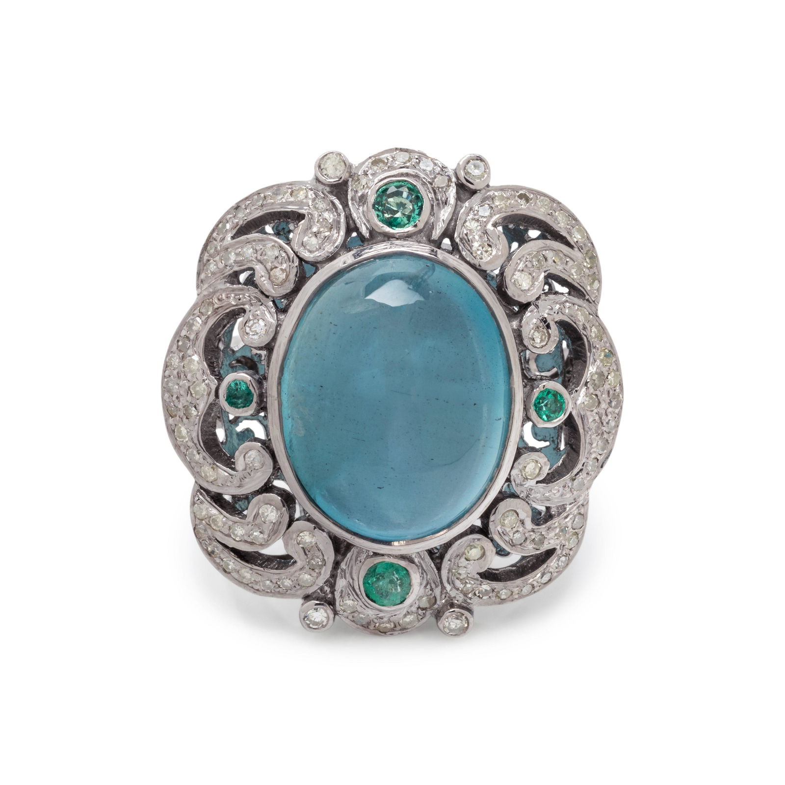 AQUAMARINE, DIAMOND AND EMERALD RING