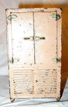SoldAntique Child's Miniature Kitchenware (3), Arcade cast metal KELVINATOR RefAntique Child's Miniature Kitchenware (3), Arcade cast metal KELVINATOR Refrigerator Still Bank, cream colored, SAVAGE Mini Stove, cast iron/metal & ROYER, Mini Stove, cast iron, VG cond w/some age-reSee Sold Price