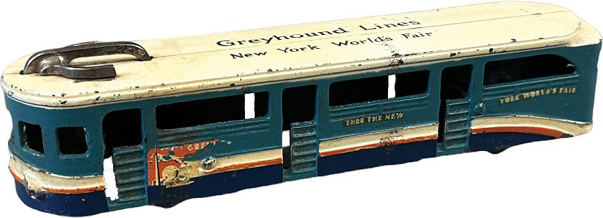 SoldLARGEST ARCADE GREYHOUND LINES BUSCast iron painted in two shades of blue body w/white roof, decals appear on sides, roof stenciled, "Greyhound Lines N.Y. World's Fair". 10 1/4" l.See Sold Price