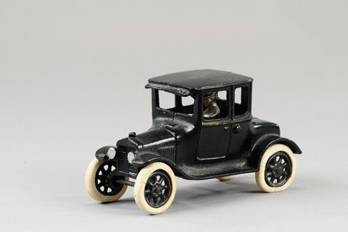 SoldArcade Model T Tudor Cast Iron with DriverBlack Model T by Arcade Toys, circa 1924. Early Ford in two-door variation with driver. Gold band highlights present, with proper silver-painted headlights. Toy at approximately 7.5" L.See Sold Price