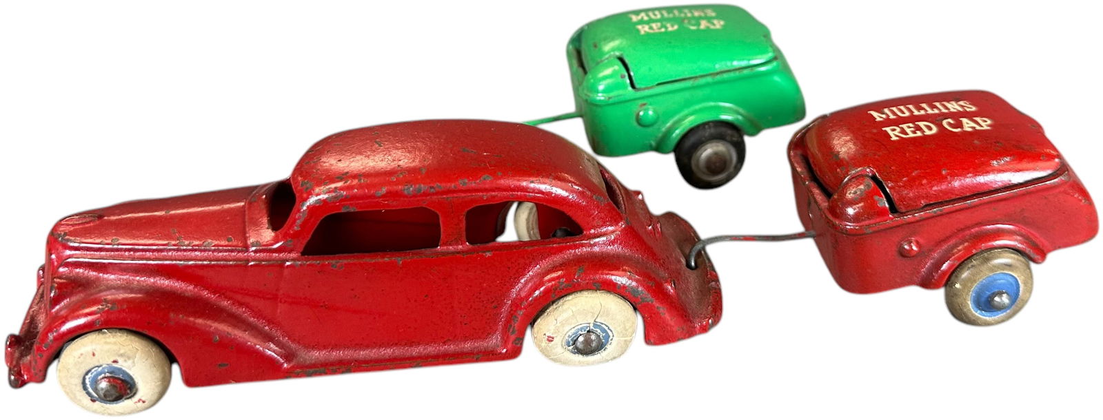 SoldARCADE SEDAN w/MULLINS RED CAP TRAILERArcade, c. 1939, cast iron, familiar red sedan pulling small blue trailer with opening lid, white roof lettering, rubber tires. 9" l.See Sold Price