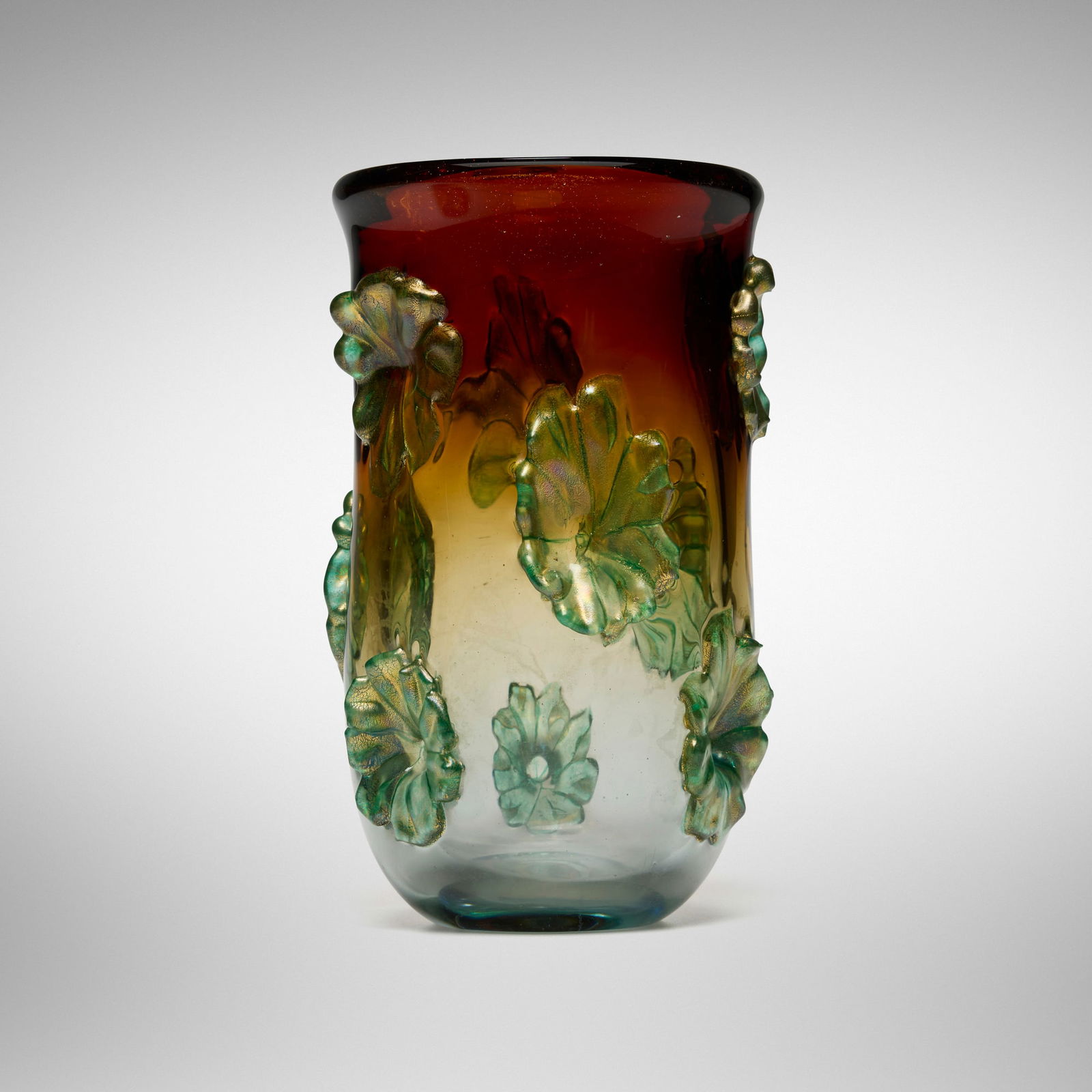 SoldArchimede Seguso - Avventurina Vase, c.1930Archimede Seguso Vetri D'Arte, Ruby & Gold Avventurina Ribbed Vase, circa 1930, paper label Dimensions: 13.25" H x 10.75" diam Property from the collection of John 'Parker' Prindle, Jr.See Sold Price