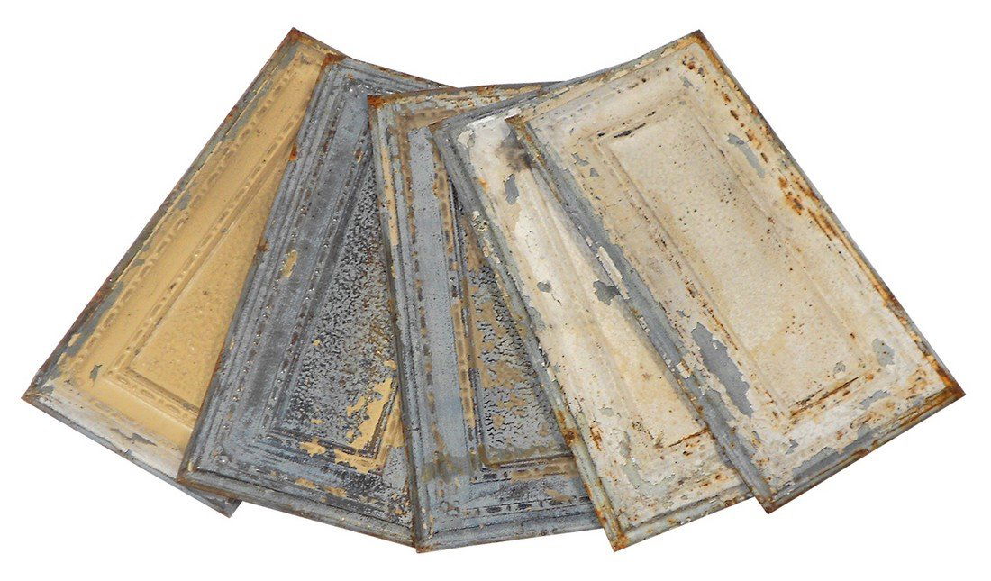 SoldArchitectural ceiling tin (65), embossed metal panelsArchitectural ceiling tin (65), embossed metal panels w/old paint, block pattern, VG cond, 12"Sq.See Sold Price