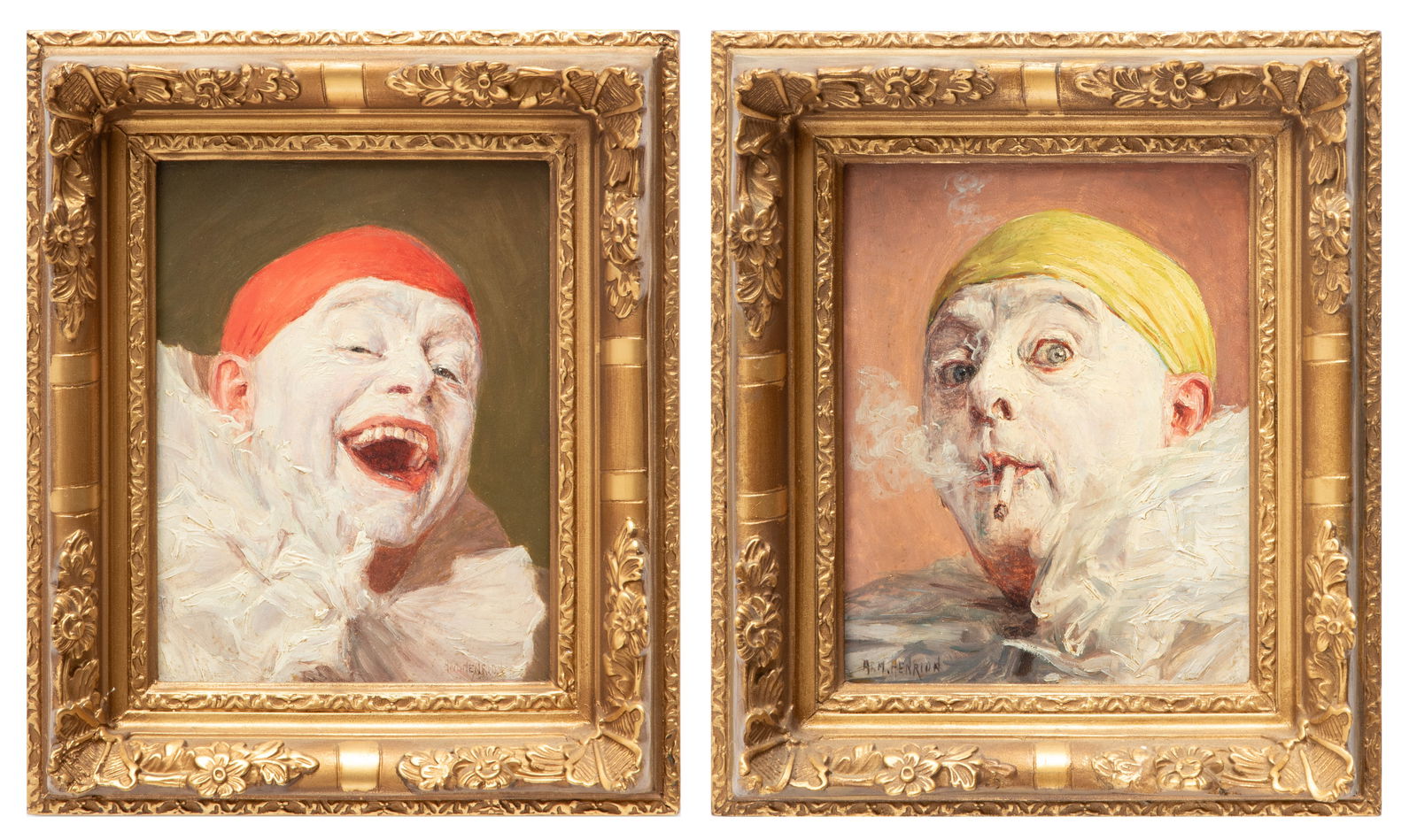 Armand Francois Joseph Henrion (French, 1875-1958) Oil on Panels, "Clowns with Cigarettes", H 7.5" W