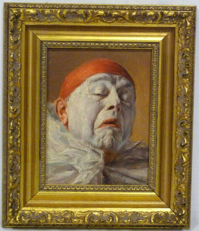 ARMAND HENRION OIL ON BOARD OF SAD CLOWN