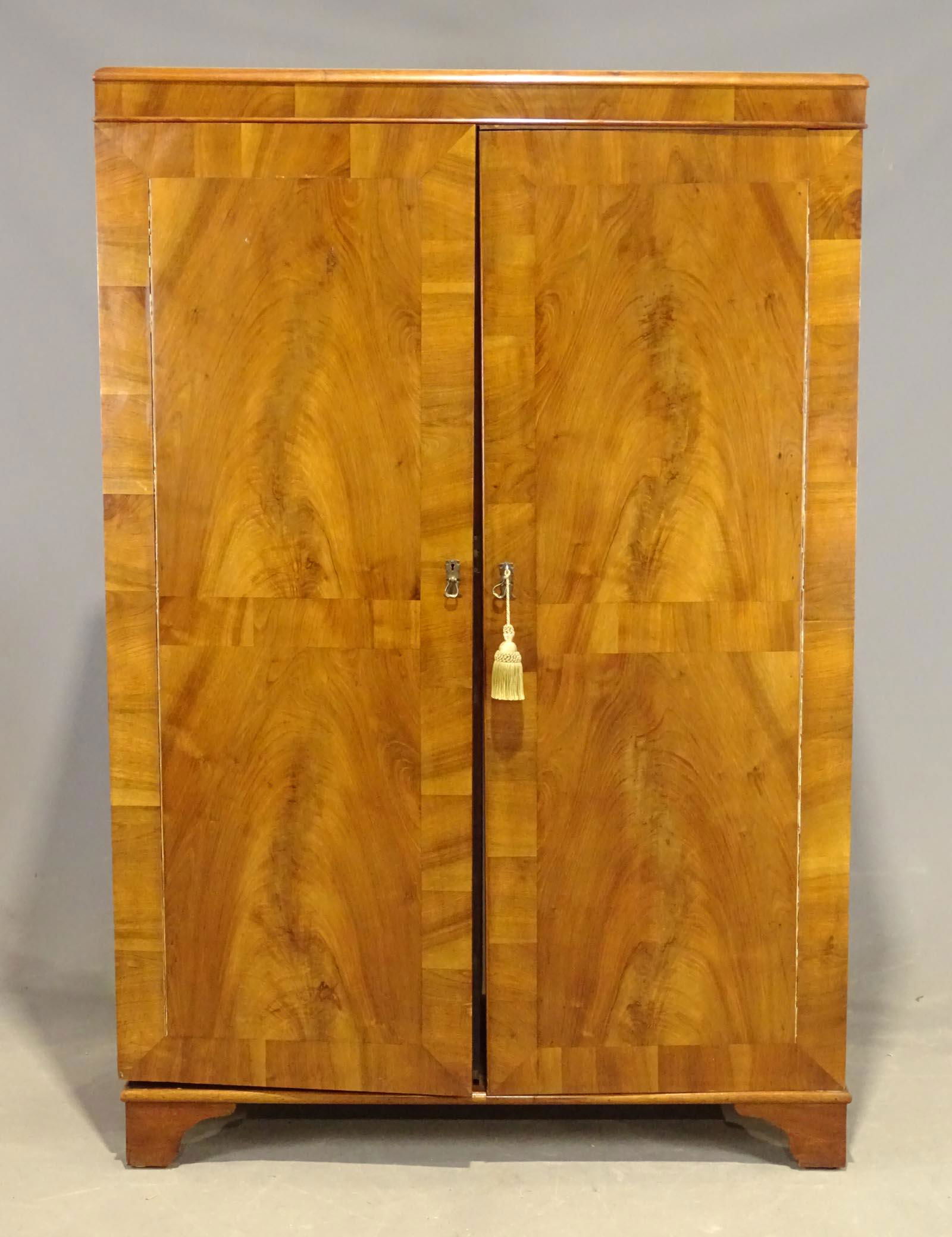 SoldArt Deco Burlwood ArmoireVintage art deco armoire Includes central beveled mirror on middle door. Two side doors also open. Knocks down for easy moving. It measures approx 78" h x 66" w x 20" d. Some minor scuffs.See Sold Price