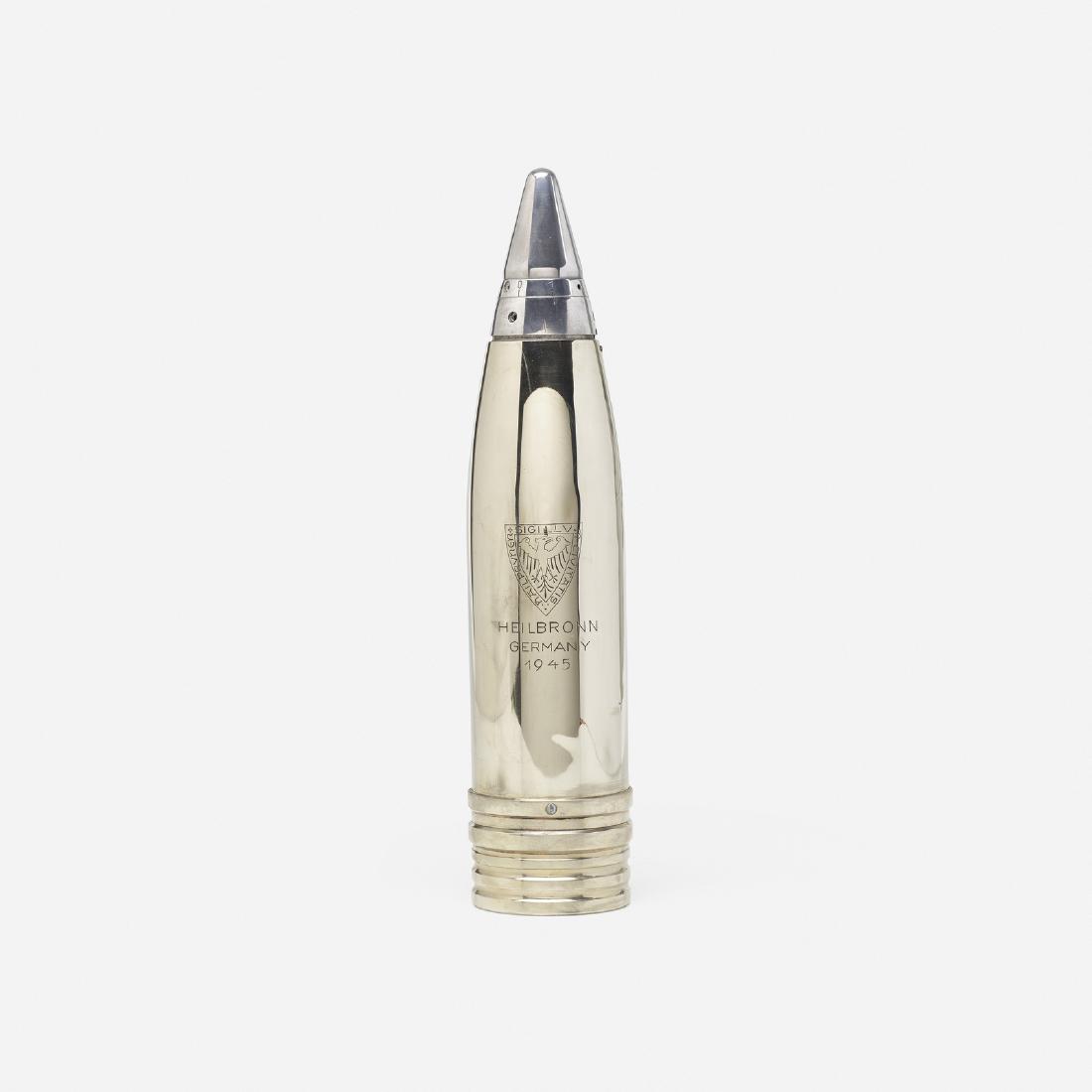SoldArt Deco, Artillery Shell decanter with lidArt Deco Artillery Shell decanter with lid c. 1935silver-plated metal, glass 16 h x 3.25 dia in (41 x 8 cm) Decanter features a glass bottle inside and three shot cups. Impressed to undersideSee Sold Price