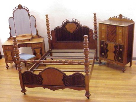 SoldArt Deco Style Bedroom SuiteThis 1920/30's American-made French Art Deco style bedroom suite includes 3 pieces: a highboy dresser, a dresser w/attached mirror, and a full size bed. It is made by Evansville in multi-colored woodSee Sold Price