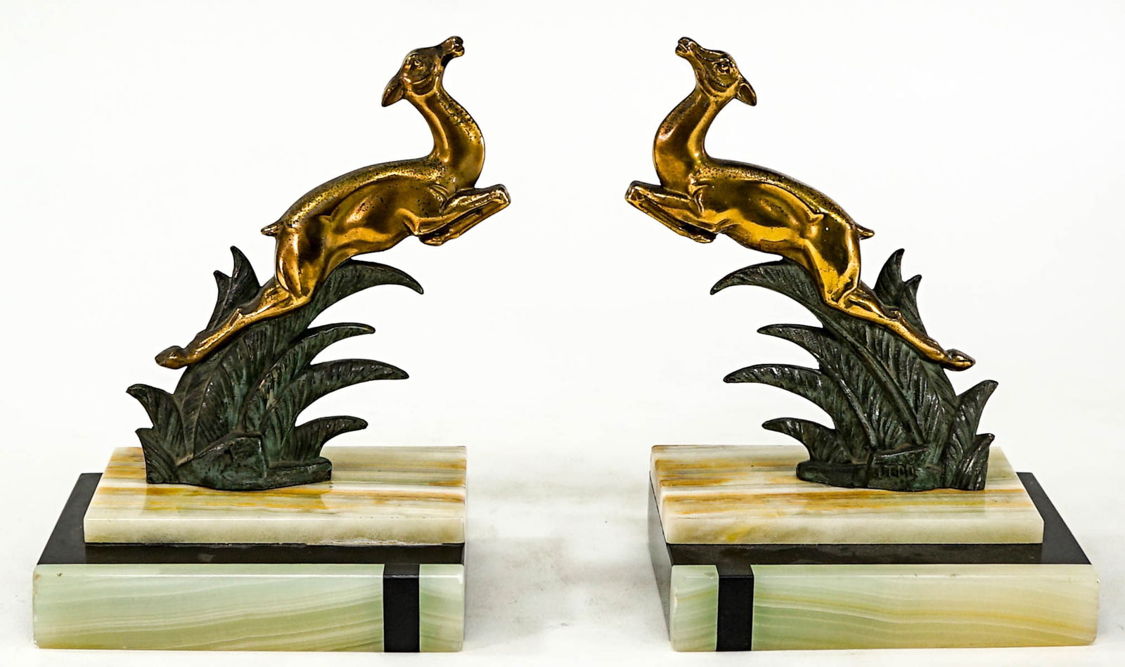 Vintage Bronzed Metal Horse Head Bookends 2pc LOTMar 12, 2026Art Deco Bronze Marble Bookends by Maurice Frecourt with Giraffes4 days LeftPair of Art Deco Style Patinated Metal Leaping Gazelle Bookends on Green Onyx BasesMar 10, 2026Art Deco Silvered-Bronze Turkey Bookends by G. Rischmann France 1930s Set of 2Mar 14, 2026Pair Art Deco Gilt Cast Iron Dancer BookendsMar 10, 2026Art Deco Silver Pewter Bookends, 1930s, Set of 2Pair of Vintage Gilt Brass Ram Head BookendsMar 17, 2026Pair of Brass Trotting Horse Bookends5 hrs LeftFrankart 1920s Cubist Modernist Black Metal Kings Of Beasts Lion BookendsMar 15, 2026Frankart 1930s Art Deco Bronze Base Gold-Tone Spread Wings Eagle Bookends B455Mar 15, 2026"Antique Gold" Norman Collection Bookends11 hrs LeftRARE C1925 "THESPIAN" CAST IRON BOOKENDS BY HUBLEY - DRAMA & COMEDY THEATER MUSE5 days LeftVandaele Pair of Art Deco Bronze Cat & Dog Bookend5 days LeftVINTAGE BRONZE ELEPHANT BOOKENDS MARBLE BASES 8"Mar 09, 2026Walter Von Nessen For Chase Art Deco 1930s Stylized Brass Cat BookendsMar 15, 2026A rare gilt bronze Han Dynasty deer figurine16 hrs Left