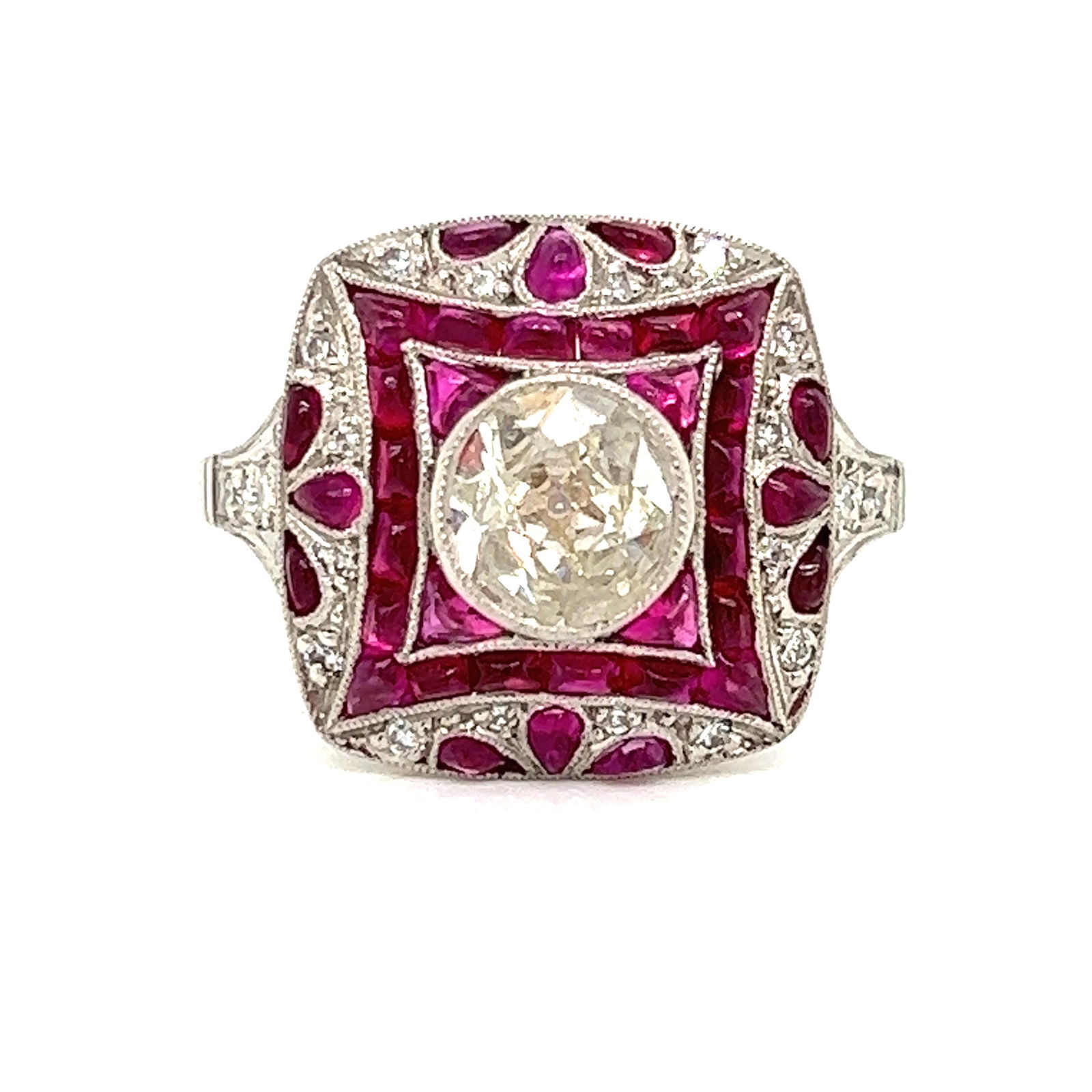 SoldArt Deco Platinum Diamond Ruby Ring3.6 grams. 5.5 sizable. The ring is set with a center round cut diamonds surrounded by four square cut rubies, and smaller diamonds on the filigree.See Sold Price
