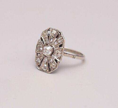 A SAPPHIRE AND DIAMOND RING in Art Deco style, set with an old European cut diamond of 1.00 carat inA SAPPHIRE AND DIAMOND RING in Art Deco style, set with an old European cut diamond of 1.00 carat in an openwork circular border set with round cut diamonds and French cut sapphires, no assay marks, s