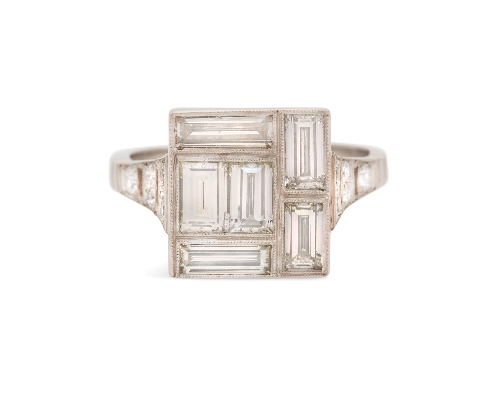 SoldArt Deco Style 18K White Gold Diamond RingArt Deco-style diamond ring crafted in 18K white gold, featuring a central round brilliant-cut diamond in a raised square setting, flanked by six smaller accent diamonds in geometric stepped shouldersSee Sold Price