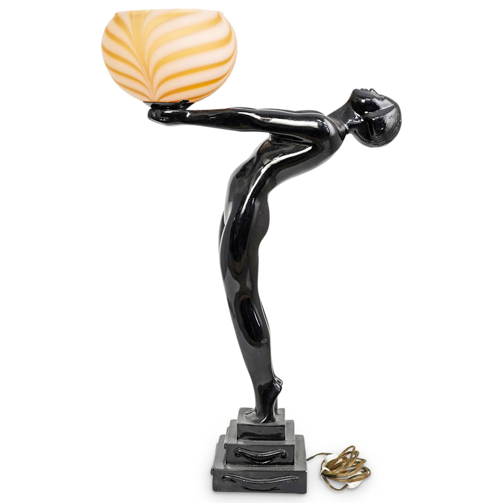 SoldContemporary Art Deco style Figural Table Lamp. Deco laContemporary Art Deco style Figural Table Lamp. Deco lady holds glass End of Day shade. -- Dimensions: H: 19 inches: W: 8 inches: D: 5.5 inches ---See Sold Price