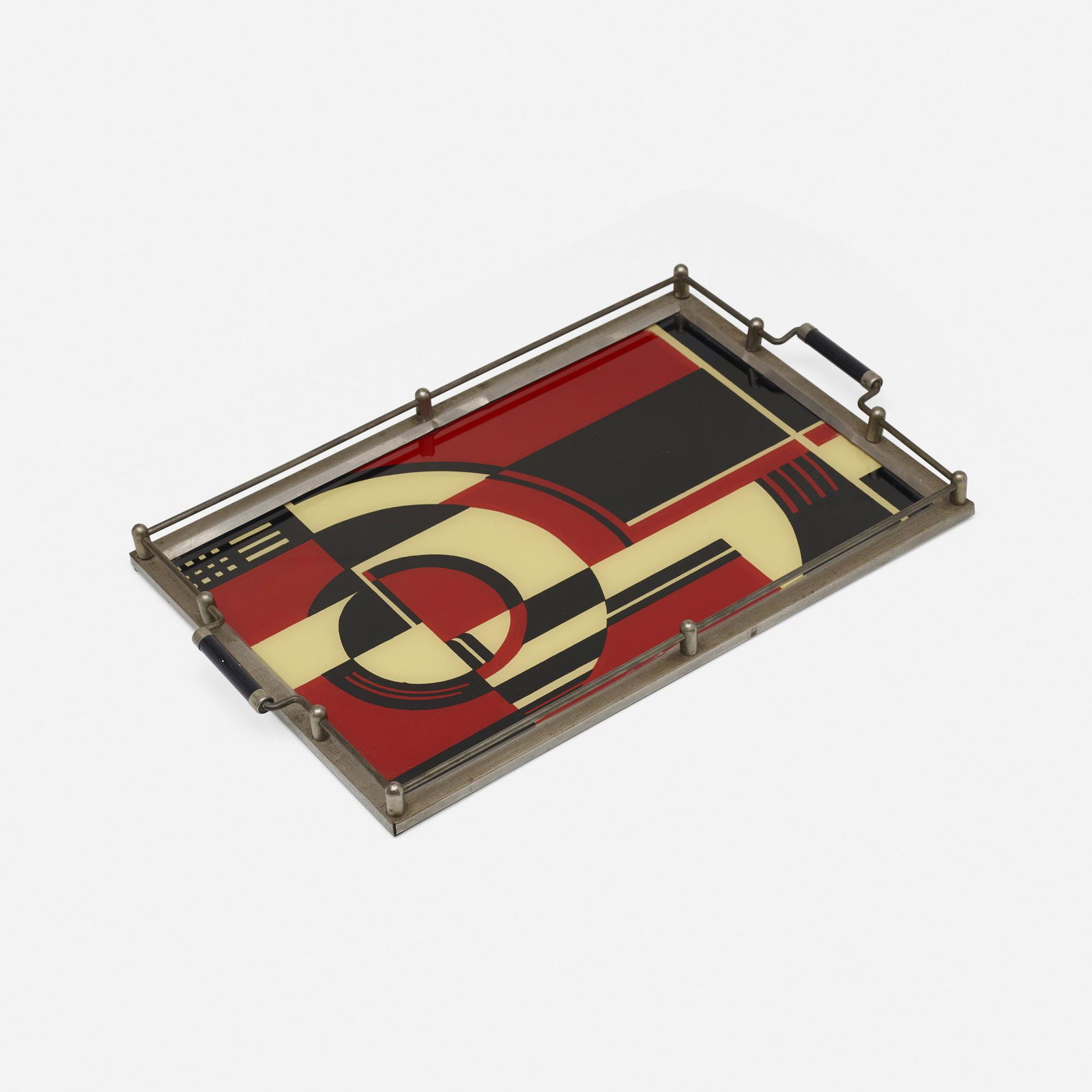 SoldArt Deco jazz trayArt Deco jazz tray USA, 1930s painted glass, chrome-plated steel, wood unmarked 19"w x 12"d x 1 3/8"hSee Sold Price