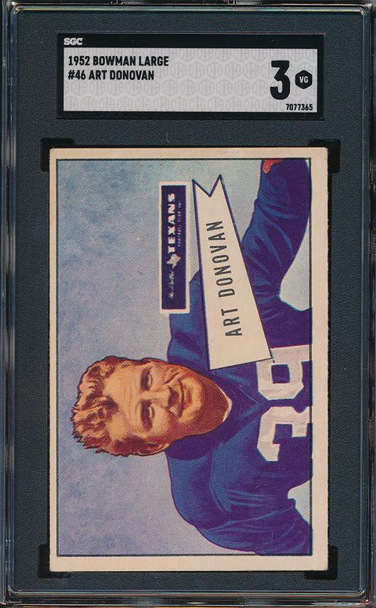 Sold1952 Bowman Lg. Football #46 Art Donovan SGC 3A card with solid eye appeal. The color is bright and clean. The near white borders are centered 65/35 L/R and 20/80 T/B. The corners have touches to very light wear. There is a very light water stainSee Sold Price