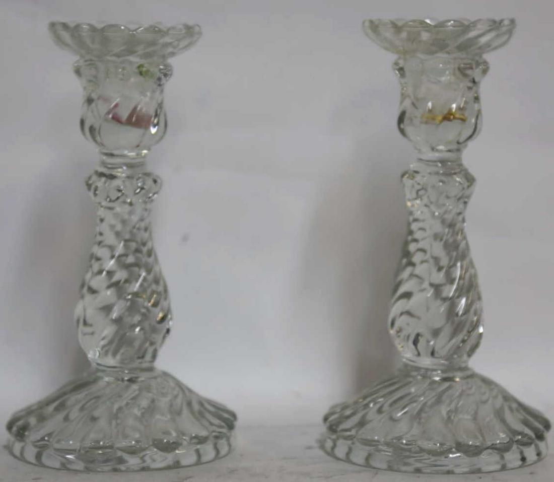 Pair of Glass Candlesticks w/ Starburst and Floral Design