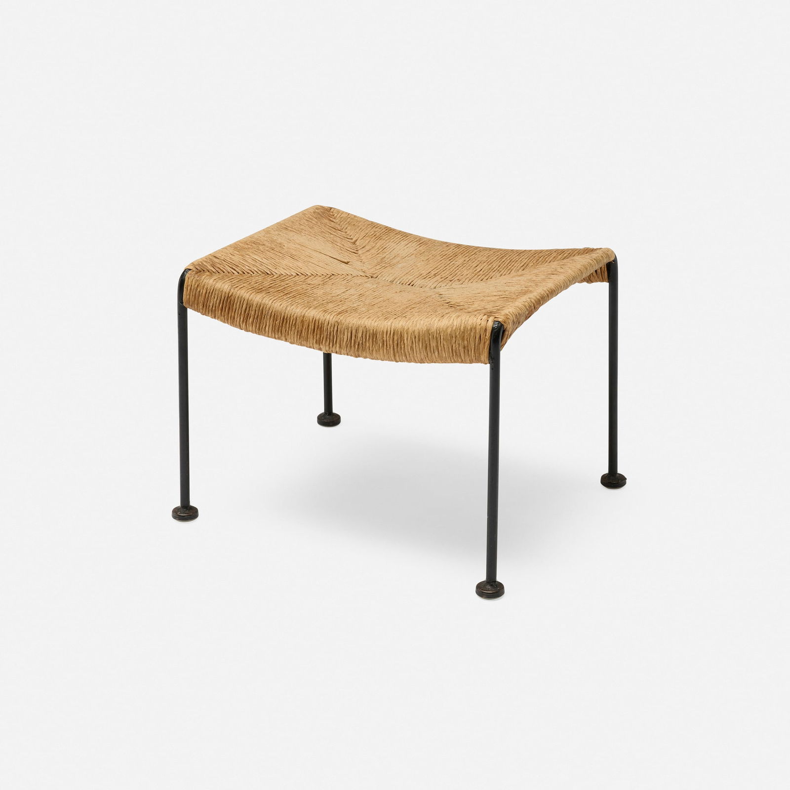 SoldATTR. ARTHUR UMANOFF IRON STOOL1950's. Unmarked. Dimensions: H 37.5" x W 17" x D 17.25" x SH 25" Condition: Metal appears repainted. Scratches, marks, and wear to wood. Few small losses at edges.See Sold Price