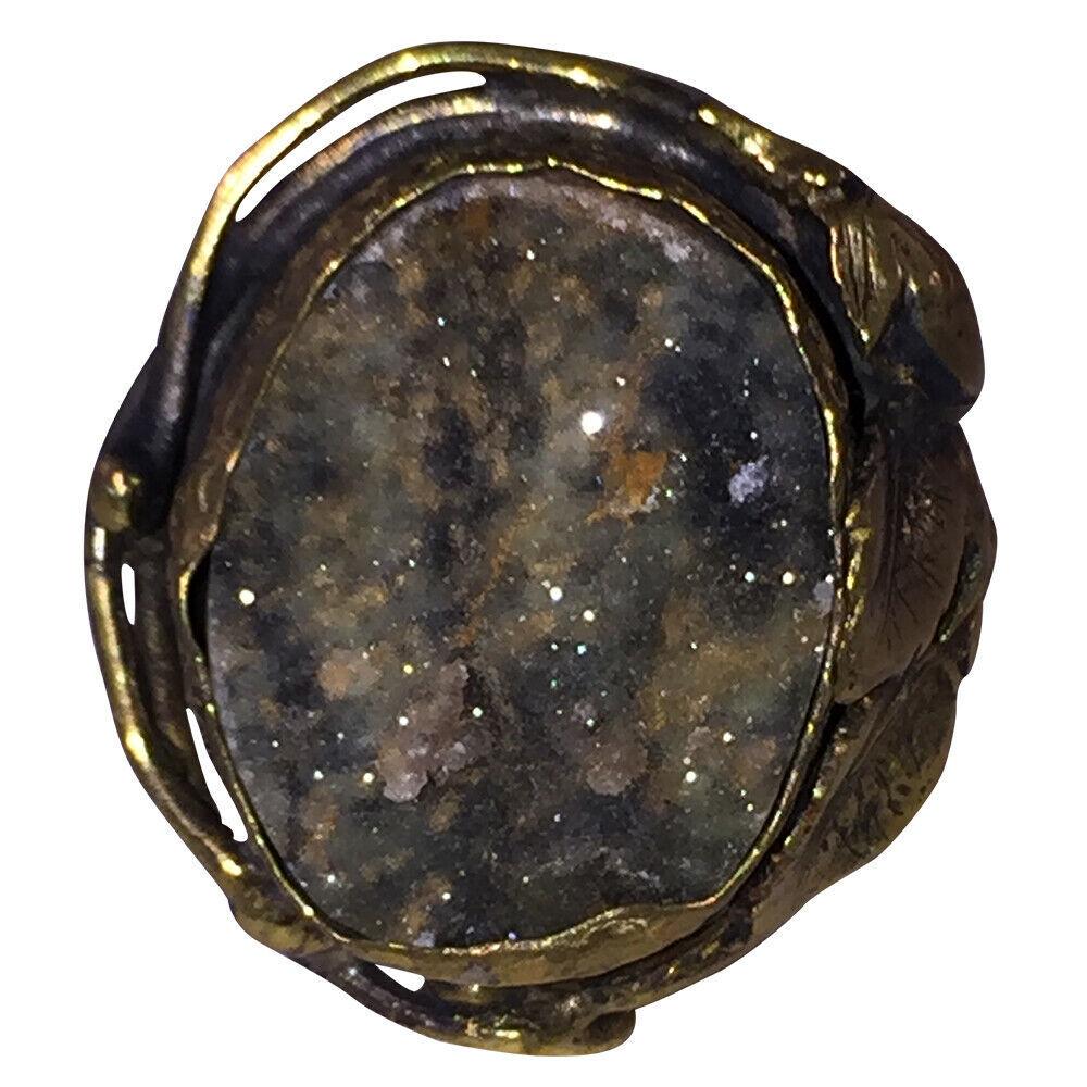 Artisan Signed Druzy Quartz Brass & Sterling Ring