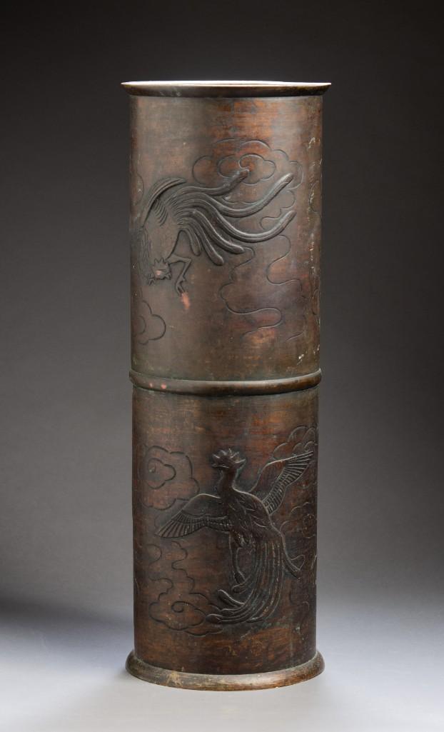 SoldJapanese Bronze Umbrella Stand, Meiji PeriodA Japanese bronze umbrella stand, Meiji Period, decorated with lotus flowers in low relief. Dimensions:Height 23 1/4in; diameter 9 1/2in.See Sold Price