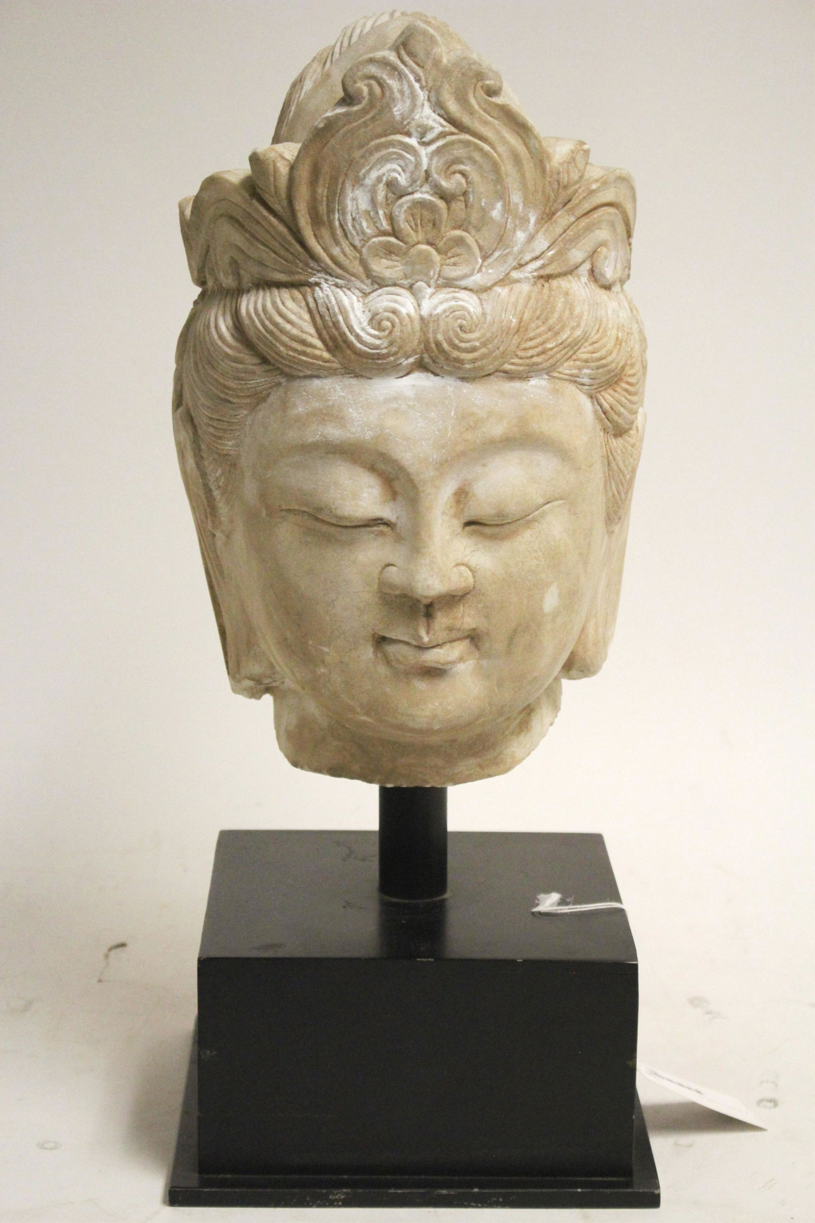 SoldAntiquities: Carved Marble Bust of BuddhaAntique, probably 4th-6th century, Southeast Asian carved marble bust of Buddha, on ebonized plinth base. [Overall: 17 1/2" H x 7 3/4" W x 7" D; Head: 11 1/2" H x 7 1/2" W x 7 1/4" D]. Erosion, wear,See Sold Price
