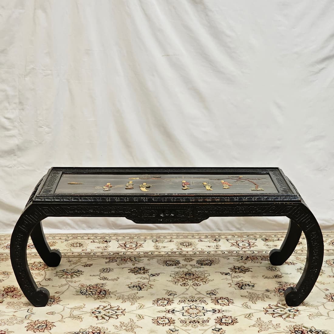 SoldASIAN BLACK LACQUER COFFEE TABLE W/ MOP INLAY + CARVEDASIAN BLACK LACQUER COFFEE TABLE W/ MOP INLAY + CARVED STONE FIGURES, 20.5"H X 50"W X 30"DSee Sold Price