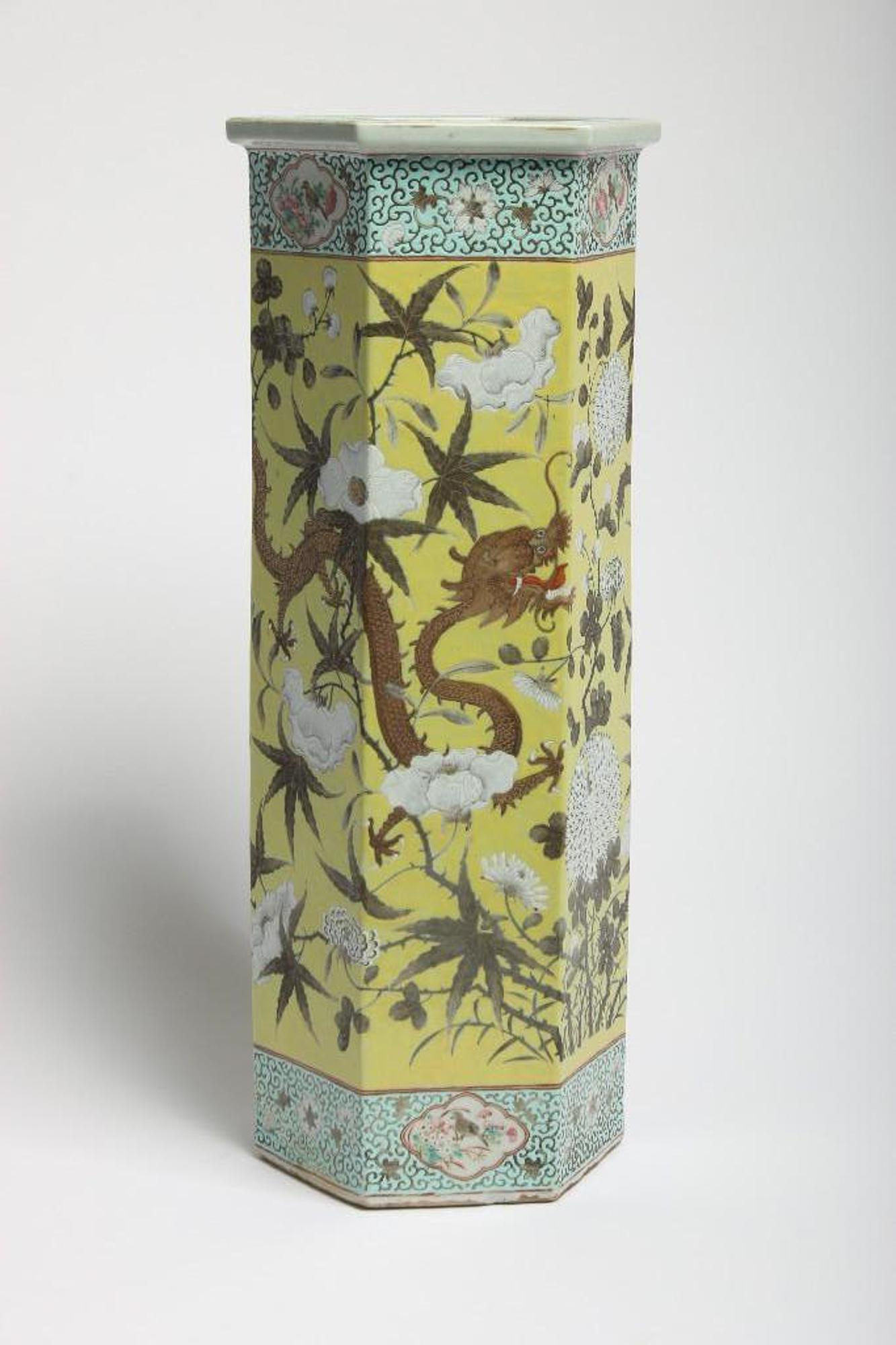 SoldASIAN FLOOR VASE W STANDWood stand. 2 pc. 44 1/2" h (overall) x 36 1/4" (vase) x 15 1/2" diameter.See Sold Price