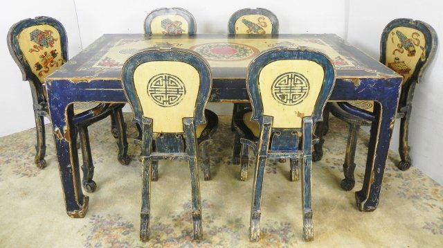 SoldAsian Style Dining Room Table & 6 chairsTable is apprx 41" x 41" and comes with a 14 1/2" leaf. No in house shipping ! Bring help to remove.See Sold Price