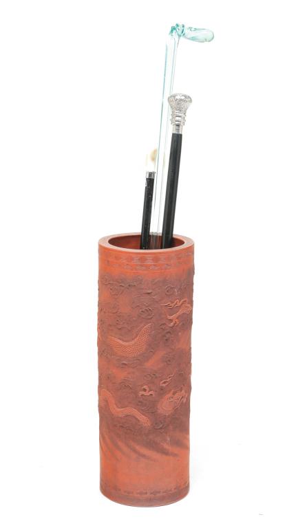 ASIAN REDWARE UMBRELLA STAND AND THREE CANES.