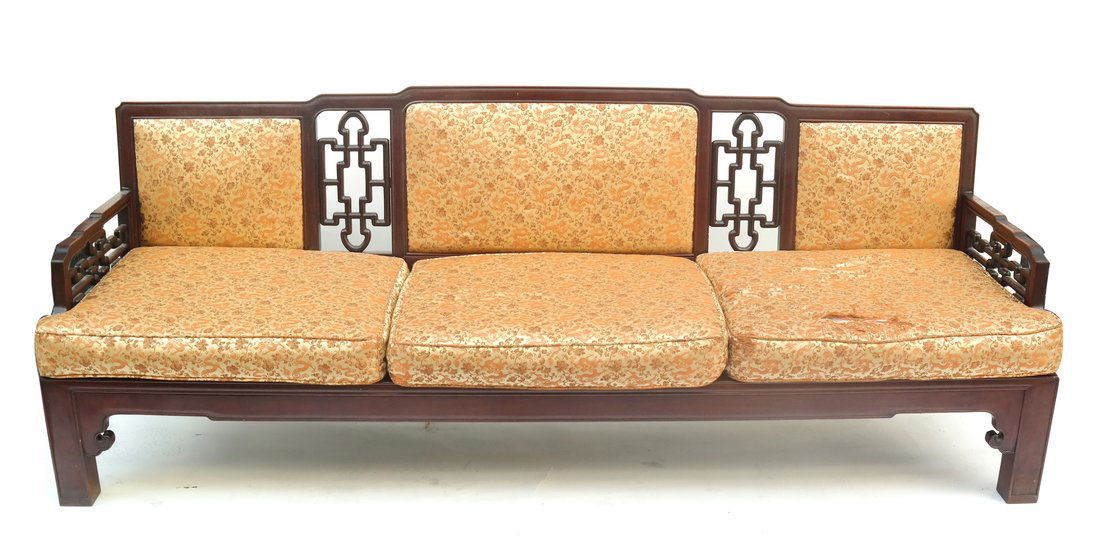 SoldAsian Style SofaBlack wood framed sofa. Black with gold and green floral design. 104" long, 29" tall, 33" deep. two 49" long seat cushions, 2 arm cushions and 5 decorative throw pillowsSee Sold Price