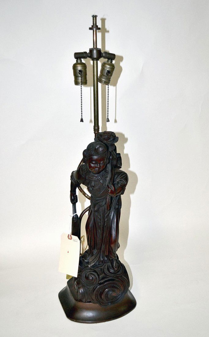 SoldPair Asian carved wood figural lampsPair Asian carved wood figural lamps, 20th c., nicely carved, approx. 18.5"h x 7.25"w x 7"d (excl. base and fittings)See Sold Price