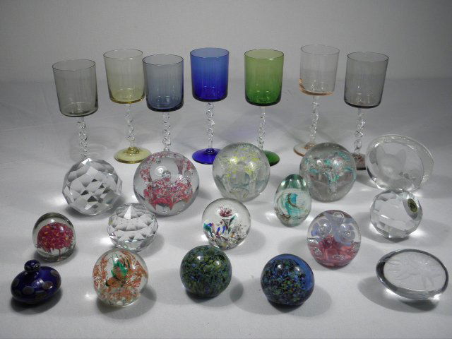 ASSORTED ART GLASS PAPERWEIGHTS & STEMWARE, ETC: 23