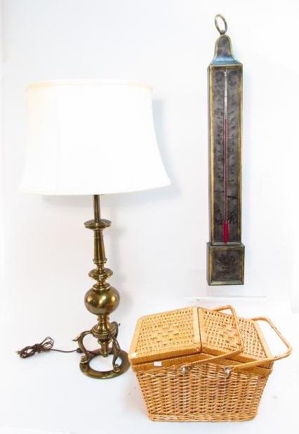 ASSORTED HOUSEHOLD LOT: TABLE LAMP, THERMOMETER &