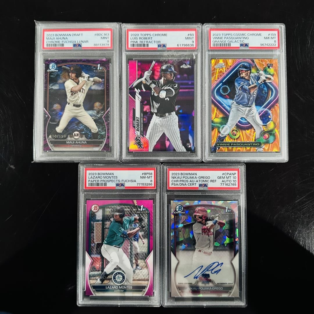 (9) Multi-Sport Card Lot - Serena Williams, Ronald Acuna Jr., Mookie BettsLot of 3 MLB Rookie Cards. Chourio, Caminero, Dominguez3 days LeftGraded Card Lot - Delgado - Belle - Piazza - Jones and MoreMar 08, 2026Lot of 4 MLB Rookie Cards. Crow-Armstrong, Caminero, Chourio, DominguezMar 04, 2026Lot of 2 Oakland A's Rookie Cards. Nick Kurtz & Jacob Wilson3 days LeftLot of 4 Baseball Inserts/Parallels. Ohtani, Hank Aaron, Juan Soto, Julio Rodriguez3 days LeftLot of 4 Numbered Baseball Cards. All Different, See Pictures for Cards/Serial Numbers3 days LeftLot of 4 2024 Bomwan Chrome 1st Bowman Mojo Refractors. All Different, See PicturesMar 04, 2026Lot of 3 MLB Refractors & Foils. Soto Prism Refractor, Acuna Refractor, Ripken Jr. FoilFeb 28, 2026Lot of 4 2025 Topps Chrome MLB Xfractors. Acuna Jr., Altuve, Kershaw, Guerrero Jr.3 days LeftLot of 4 NFL Rookie Cards. Bryce Young, Chase Brown, Omarion Hampton, Luther BurdenFeb 28, 2026Lot of 3 Xavier Worthy Rookie Cards. All Different, See Pictures. Kansas City Chiefs3 mins LeftLot of 4 2025 Topps Chrome MLB Xfractors. Mookie Betts, Tarik Skubal, Soto, Tatis Jr.3 mins LeftLot of NFL QB Cards. Josh Allen, Joe Burrow, Jared Goff Silver Mosaic, Spencer Rattler Pink RC3 days LeftVintage collectible baseball cards3 days LeftVintage collectible baseball cards3 days Left