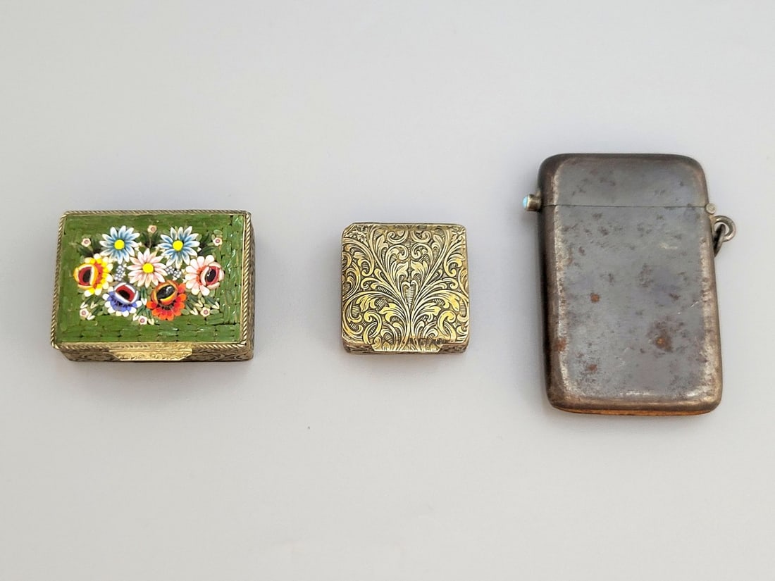 Lot of 4 Trinket Boxes2 days LeftVTG Box Assortment, Marble, Leather, Wood, 6pc LOTFeb 26, 2026Lot 6 19th C Lithographed Tin Christmas BoxesMar 07, 2026Lot of Seven Hand Painted Wood & Paper Mache Boxes6 days LeftAntique Silver Chinese Matchboxes2 days LeftSterling Silver Enamel Compacts Cigarette Case 10p1 day LeftGroup of Smoking & Other AccessoriesMar 03, 20263 Antique Powder Tins w Schaghticoke Powder CoMar 07, 2026(3) SMALL SILVER MOUNTED BOXESFeb 20, 2026THREE SILVER BOXES, INDIA, 20TH CENTURY5 days Left(3 pcs) Assorted Antique Silver Plated Match Safes1 hr Left(3 Pc) Antique Sterling Silver Match SafesFeb 17, 2026A Group of Chased Silver Boxes/Compacts3 hrs LeftCollection of Silver Diminutive Covered Boxes, 5Feb 26, 2026SEVEN OTTOMAN SILVER FILIGREE BOXES, 19TH CENTURY5 days LeftThree silver cigarette boxes,