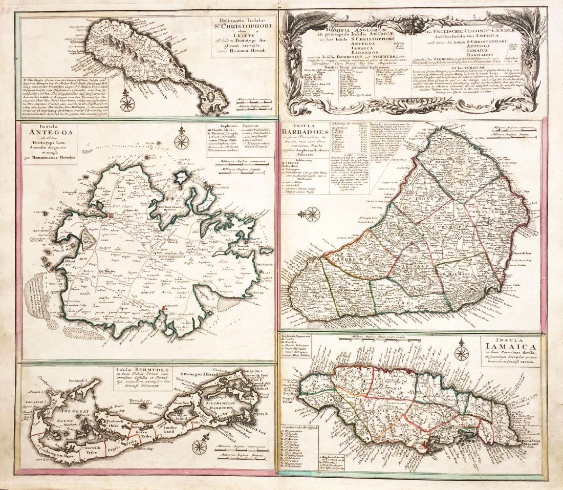 SoldHomann Heirs: British Caribbean and Atlantic IslandsDominia Anglorum in praecipuis Insulis Americae On one sheet, five highly detailed maps of British possessions in the Caribbean and Atlantic: St. Kitts, Antigua, Bermuda, Barbados, and Jamaica. St. KiSee Sold Price