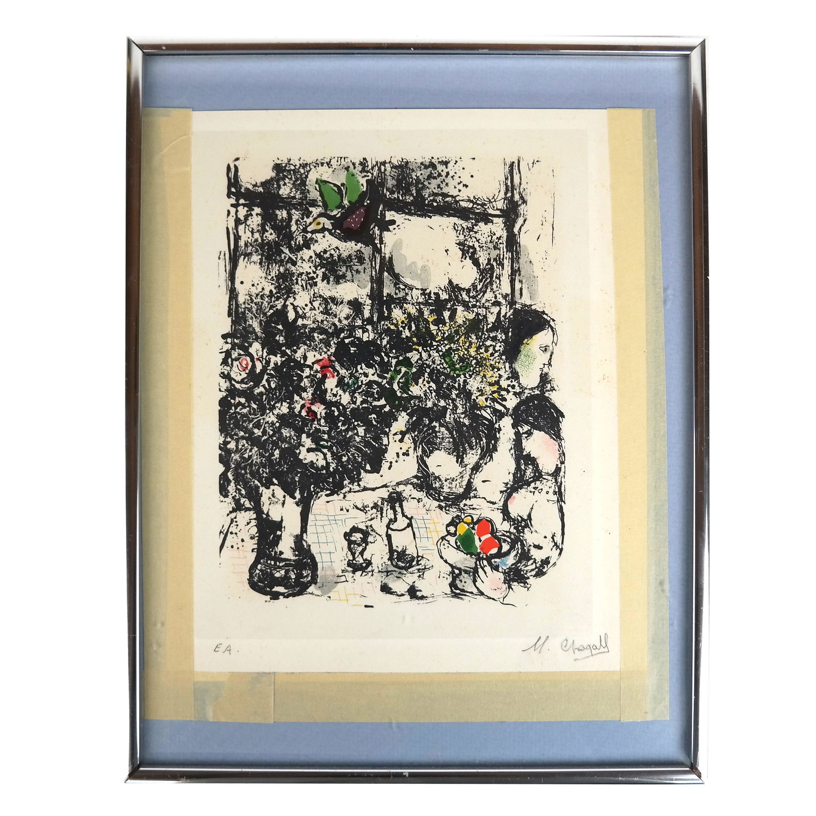 SoldMarc Chagall Figures & Bouquet Flowers LithographMarc Chagall Figures & Bouquet Flowers Lithograph. Signed Marc Chagall in plate, pencil numbered XXXVI/CCV . Vintage. Framed. Size: 26x20 image, 35x29 outside frameSee Sold Price