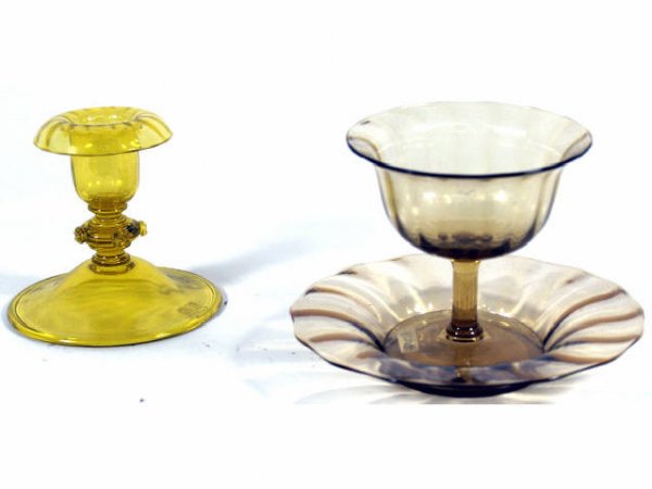 SoldSTEUBEN ATTRIBUTED SWIRLED ART GLASS ARTICLES, LOT OFSTEUBEN ATTRIBUTED SWIRLED ART GLASS ARTICLES, LOT OF THREE, Pomona Green and amber, comprising two shape 6045 candlesticks, and a shape 6045 compote, none signed, each having a polished pontil mark.See Sold Price