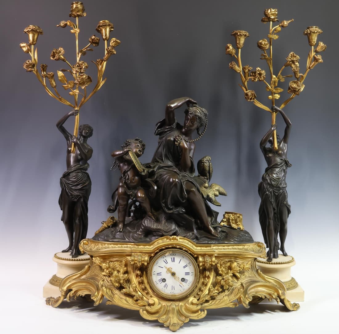 (3) EMPIRE STYLE BRONZE & MARBLE MANTEL CLOCK & CANDELABRA GARNITURE SET5 days Left(3) FRENCH LOUIS XVI STYLE ORMOLU-MOUNTED MARBLE CLOCK & CANDELABRA GARNITURE SET5 days Left(3) SEVRES STYLE PORCELAIN & BRONZE MANTEL CLOCK & CANDELABRA GARNITURE SET5 days Left(3) LOUIS XVI STYLE ORMOLU-MOUNTED ROUGE MARBLE CLOCK GARNITURE SET5 days Left(3) FRENCH MARBLE, SILVERED BRONZE & ORMOLU MANTEL CLOCK & GARNITURE SET5 days Left19TH C. BRONZE AND WHITE MARBLE FIGURAL CLOCK5 days LeftFrench Figural Mantel Clock, Bronze & Wood BaseMar 15, 2026FRENCH BRONZE MANTLE CLOCK CASE4 days LeftAlbert-Ernest Carrier Belleuse, French Napoleon III Gilt & Patinated Bronze 3-Piece3 days LeftMagnificent French Monumental Mercury Gilt Bronze Figural Clock Set By L. Marchand3 days LeftA large and antique French Rococo style gilt bronze mythological figural decorated mantel clock set7 days LeftBronze clock "ROMANTIC SCENE"Feb 26, 2026BRONZE AND MARBLE MANTLE CLOCK, HENRY COX, NYMar 07, 2026Charles X Gilt Bronze Figural Mantel ClockApr 07, 2026French Louis XVI Style Bronze Mantel Clock by Alfred Beurdeley3 days LeftA ROCOCO STYLE BRONZE ORMOLU AND PORCELAIN MANTEL CLOCK, FRENCH, MID 19TH CENTURY,4 days Left