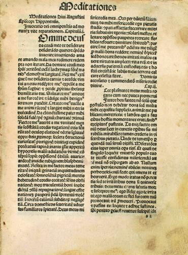 Sold1498 INCUNABULA Aurelius Augustinus Meditationes antique VELLUM RARE INCUNABLEAugustinus, Aurelius Meditationes - Soliloquia - Pseudo- Bernardus Claravallensis: Meditationes ... Brescia, Angelus Britannicus, 8 October 1498 Size 4 1/4 by 5 3/4" Gothic text on two columns, xylogrSee Sold Price