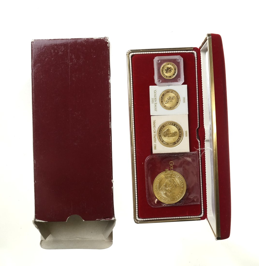 Sold2001 Gold Proof American Eagle 4 Coin Set2001 American eagle gold proof four coin set, all from the West Point mint, with original velvet box and packaging, including:One 1 oz fifty dollar coin, containing 1.0909 troy oz of gold (33.931 g).OSee Sold Price