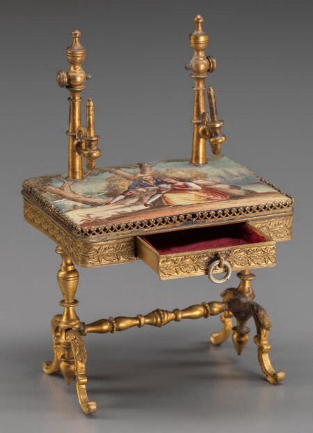 Viennese and Austrian enamel painted miniature pitchers and stein, 19th C., three pieces, including:Viennese and Austrian enamel painted miniature pitchers and stein, 19th C., three pieces, including: Viennese pitcher with figural white metal handle, several vignettes throughout featuring courting c
