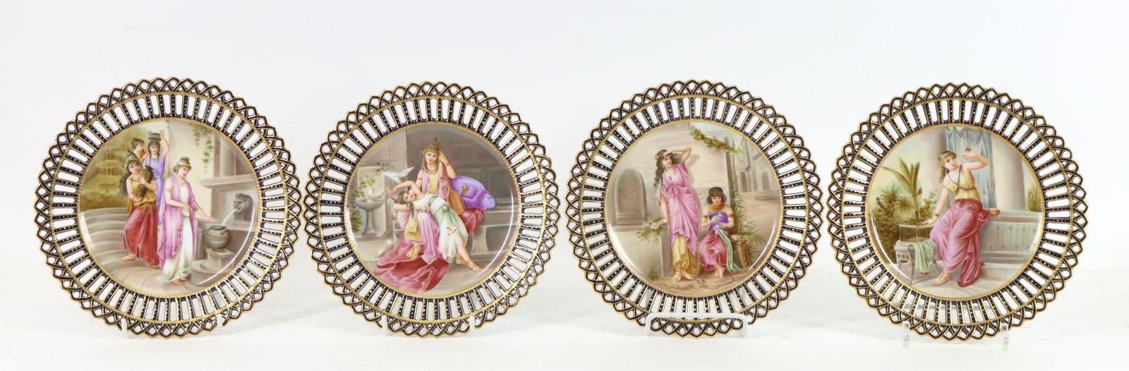 SoldAustrian Porcelain Dessert PlatesAustrian porcelain set of (4) plates featuring hand painted Romanticized historical scenes, "Griechinnen (Greeks)", "Romische Brunenmadchen (Roman Fountain Girls)", "Im Frauengemach (In the Women's QuSee Sold Price