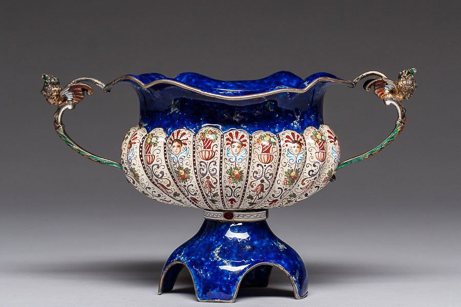 SoldViennese enamel and silver double-handled vase by Rudolf Linke, late 19th C., Austrian, "RL" makersViennese enamel and silver double-handled vase by Rudolf Linke, late 19th C., Austrian, "RL" makers mark on both handles, Viennese import stamp and rubbed hallmark, not tested for silver to prevent daSee Sold Price